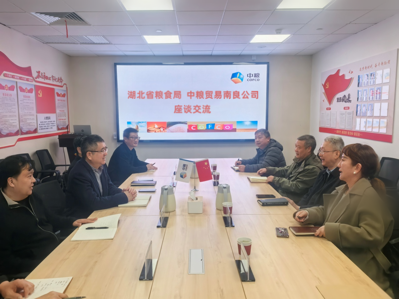 新春伊始,万象更新。在全省上下积极投入支点建设,奋力冲刺“开门红、开门好”浓厚氛围中,2月7日,湖北省粮食局负责人带领局产业处、湖北粮网一行,专程赴中粮贸易南良有限公司开展新春走访,向企业致以诚挚的节日问候,并围绕深化粮食产销合作、共促产业高质量发展进行深入交流。座谈交流中,省粮食局对中粮贸易南良有限公司长期以来在保障地方粮食安全、促进粮食产业经济发展、支持粮食在线交易等方面给予的大力支持表示感谢。充分肯定中粮贸易南良有限公司一直保持高度的政治责任感和使命担当,在疫情最危难的时刻显身手,通过武汉粮食交易中心成交了10万吨定向饲料粮,并进行规范处理,为保供稳市发挥了不可替代作用,彰显了国企的担当,为保障粮食安全、稳定作出了重要贡献。希望今后能进一步发挥自身强大的号召力与引领力,加强央地合作,特别是利用国家粮食交易平台,巩固扩大贸易合作,共同带动上下游企业一道做大做强,省粮食局、湖北粮网将继续做好“店小二”,为企业在粮食交易、市场推广、品牌打造等方面做好服务。中粮集团湖北区域办公室王世学、中粮贸易南良有限公司研督员冯峰先后发言,对省粮食局一行的到访表示欢迎,对湖北粮网对企业的支持合作表示感谢,热情介绍了过去一年的成绩和新一年的发展规划,他们表示,中粮集团非常注重湖北市场,重仓投资湖北,在湖北布局企业数量居于前列。公司也将继续发挥央企资源整合优势,依托省粮食局的政策引导,利用好国家粮食交易平台资源禀赋,全力谋划新年工作,面对新形势新任务,希望与湖北粮网进一步拓展合作,以“优势互补、协同创新”为原则,在渠道建设、粮源拓展方面深度交流,擦出火花,为湖北粮食安全与产业发展奠定更好基础。湖北省粮食局产业与市场处、湖北粮网、中粮贸易南良有限公司有关部门负责人共同参与调研座谈。
